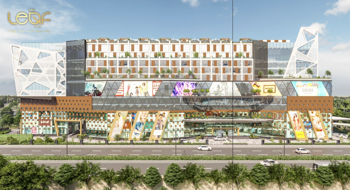 The Leaf Mall offers commercial retail shops (250–1,070 sq.ft), food court spaces, multiplex, banquet hall, and a 90-key hotel.